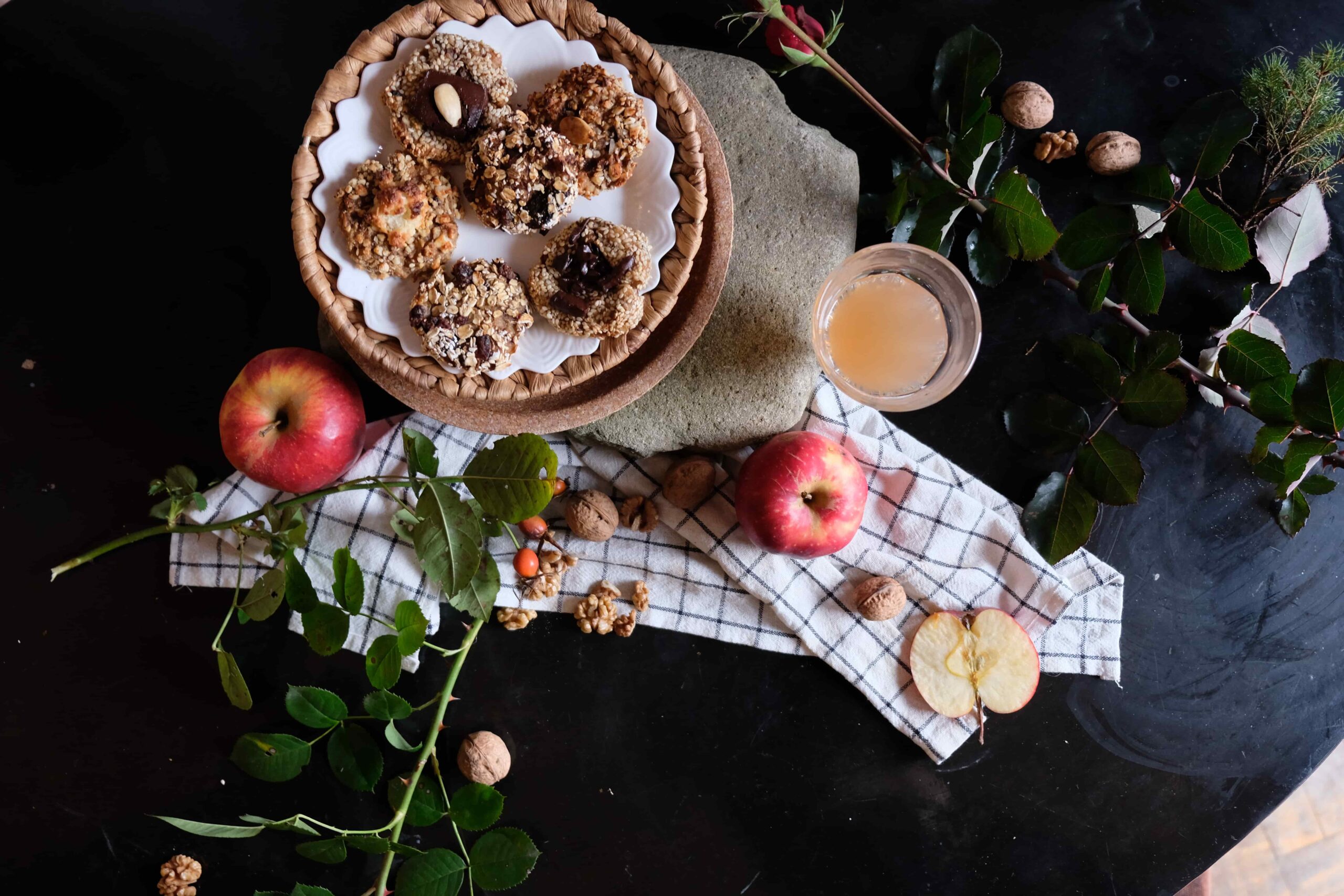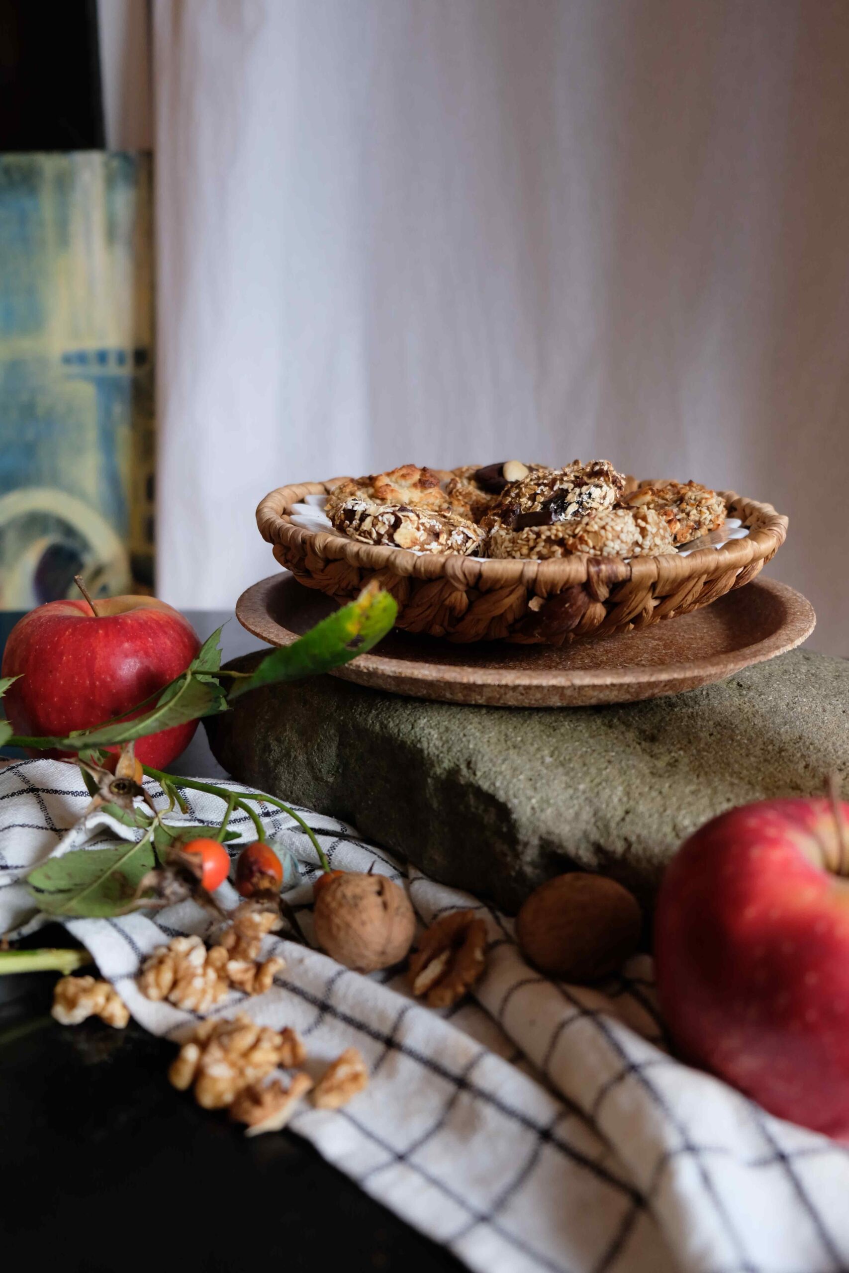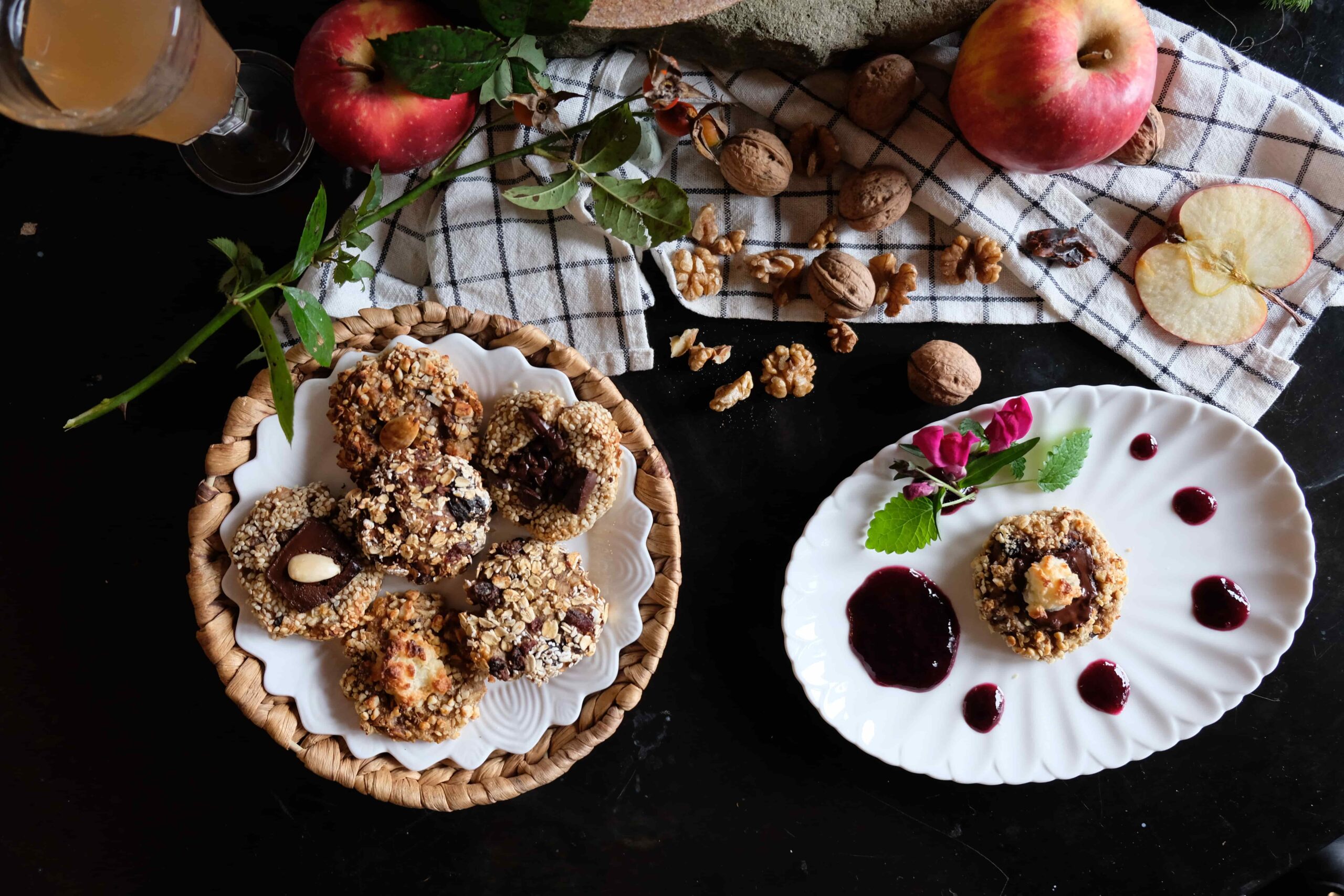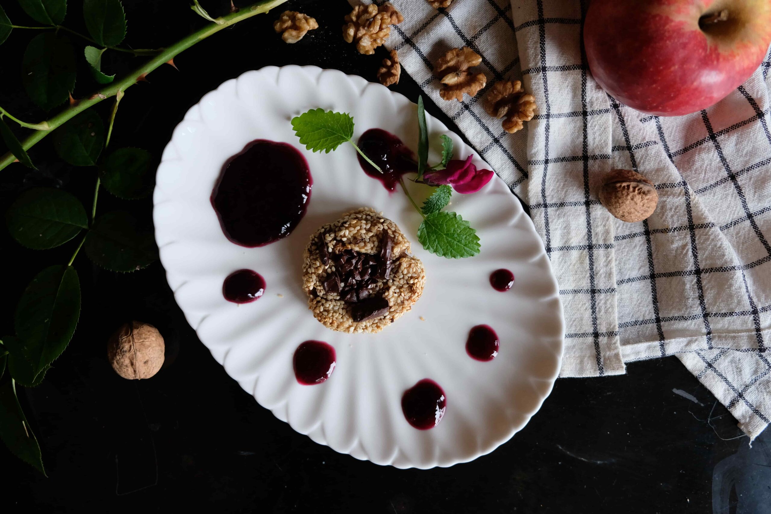 Wegańskie ciasteczka owsiane z ciemną czekoladą i bakaliami w sezamie, kokosie, saute.